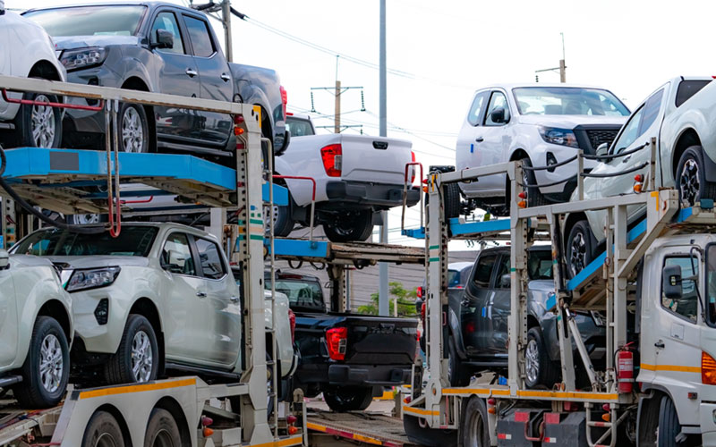 Open transport involves shipping vehicles on an open trailer, typically alongside several other vehicles. This method is widely used and commonly seen transporting vehicles on highways.